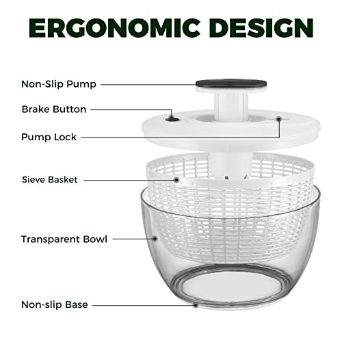 • Making Health Easier: We are looking for a solution for hand-washed lettuce, the professional salad spinner will be your best choice. It works with the pump on top with one hand, and then you can push the brake button down to stop it from spinning. The effective salad spinner leaves your lettuce free of excess water in seconds, ready to add to your salad!