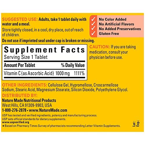 Details: Nature Made Extra Strength Vitamin C 1000 mg is a dietary supplement that supports immune health, provides antioxidant support, and aids in iron absorption. Sourced from high-quality ingredients, these gluten free Vitamin C 1000mg tablets are antioxidant supplements that have no color added, no artificial flavors, and no added preservatives. Vitamin C is an antioxidant that helps support your immune system and is also needed for collagen synthesis to support overall skin health. If you are not receiving enough Vitamin C from your daily diet or taking a Vitamin C supplement, then these Nature Made 1000 mg Vitamin C tablets can help. Adults take one 1000mg Vitamin C tablet daily with water and a meal. Nature Made supplements are quality you can trust. USP has tested and verified ingredients, potency, and manufacturing process. USP sets official standards for dietary supplements. Visit the USP verified website for more information. *Based on a survey of pharmacists who recommend branded vitamins and supplements.