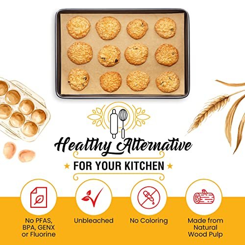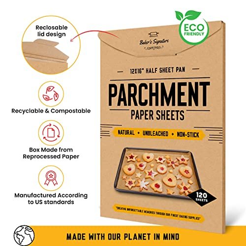 Details: Baker’s Signature Parchment Paper Baking Sheets Our parchment paper baking sheets are truly a baker’s must have. Baker’s Signature sheets will not curl, burn or stick taking all the hassle out of your baking. Pre-cut 12” x 16” parchment sheets are sized just right for the standard cookie sheets. They lay flat right out of the box and come in easy to store packaging to maintain freshness and shape. Cleanup Easier Than Ever Save time by lining your baking pan with parchment paper sheets instead of measuring and cutting pieces from conventional parchment rolls. When done baking, simply slide the parchment paper and baked goods onto a cooling rack leaving the tray clean! Non-Toxic and Unbleached Baker’s Signature parchment sheets are eco-friendly and unbleached. Made from 100% natural wood pulp with an addition silicone coating. They are more pliable than the white parchment paper and because they are unbleached, they are better than using aluminum foil and Quilon parchment sheets. So Many More Different Uses Besides Baking Our sheets are not only perfect for baking sweets, they work great for cooking fish, chicken, and pizza. Since they are moisture proof, they can be used for beautifully wrapping any type of food. Whether you are wrapping sandwiches for the kids or making a lunch to-go, our sheets will keep your meal fresh and safe. Baker’s Signature sheets are also microwave friendly. Get the most amazing parchment paper sheets on the market today and enjoy hassle free baking for years to come!