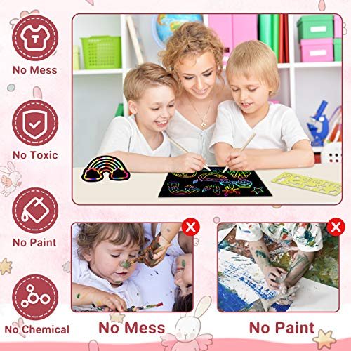 • 🍎🍬Superior & Safety Art Paper: 🎁No ink, no messy & non-toxic, these magic scratch papers made of premiun paper, thick, smooth and safe for kids. Inspire the infinite the imagination and creativity of your children without any harm and mess; Perfect toy gift for girls 3 4 5 6 7 8 9 10 11 12 year old